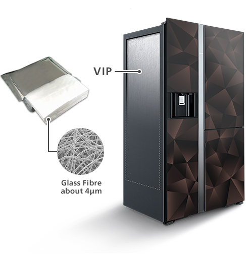 VIP is a thin panel with a very fine glass fibre vacuum inside, giving an extremely high heat insulation performance - much higher than that of Urethane, It prevents external heat from escaping to achieve exceptional energy savings. Cooling retention is 15 hours, with the highest heat insulation performance during power cut.