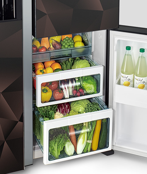 The secret to longer-lasting freshness is reduced oxygen levels. Hitachi’s original vacuum preservation extracts air to maintain approx. 0.8 atm (atmospheric pressure).The meat,fish and dairy products are kept fresh and nutritious , and ready to cook without defrosting.